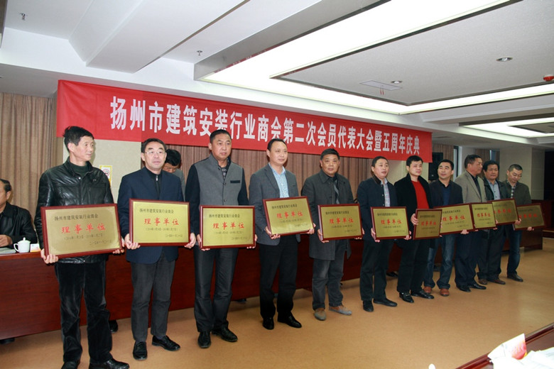 11月28日,揚州市建筑安裝行業商會在高郵市隆重召開第二次會員代表大會暨成立五周年慶典活動,46家會員企業代表參加,揚州市人大副主任、市工商聯主席、總商會會長孫永如,市委統戰部副部長、揚州市工商聯黨組書記、總商會黨委書記趙振東,市工商聯、總商會秘書長劉俊,市民政局社團管理處處長張紹華等出席會議,市房地產商會、建筑業協會等兄弟友好商會會長列席會議。