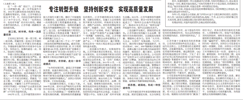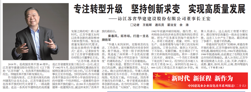王宏董事長接受《建筑時(shí)報(bào)》專訪:專注轉(zhuǎn)型升級,堅(jiān)持創(chuàng)新求變,實(shí)現(xiàn)高質(zhì)量發(fā)展 時(shí)間:2018-09-11 4121 9月10日,《建筑時(shí)報(bào)》頭版及微信公眾號(hào)對王宏董事長的專訪給予了刊載。 王宏董事長在專訪中就江蘇華建成立36年來,是如何在改革開放的時(shí)代大背景下,走出一條具有華建特色的高質(zhì)量發(fā)展之路,跨入新時(shí)代,江蘇華建又是如何以改革創(chuàng)新的進(jìn)取精神不斷轉(zhuǎn)型升級,契合高質(zhì)量發(fā)展的時(shí)代要求,創(chuàng)造出獨(dú)特的華建模式進(jìn)行了詳細(xì)介紹。