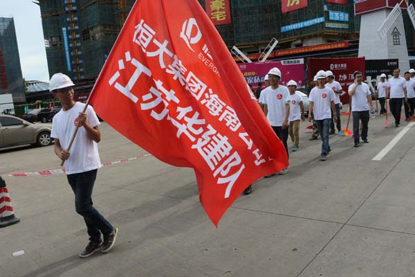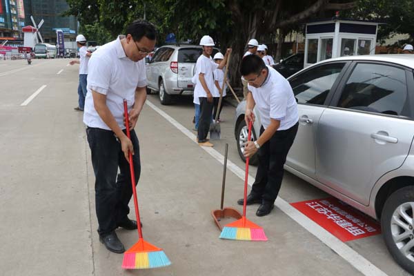 江蘇華建積極響應海口市“雙創”活動 時間:2015-09-01 2723 8月29日上午,海口市龍華區“雙創”啟動大會在我公司承建的恒大外灘中心項目現場召開,龍華區區委書記王東等領導出席啟動儀式,公司副總、海南分公司總經理王宏到會并做表態發言。 隨后,會場舉辦“我愛海口,力爭雙創”授旗儀式,并組織志愿者“自掃門前雪”,手拿掃把、簸箕等工具,將所屬衛生轄區打掃得干干凈凈,以實際行動來踐行“雙創”工作。