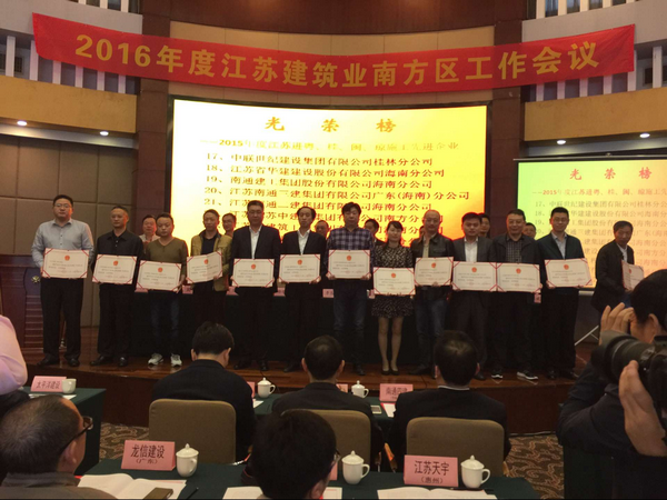 3月24日上午,江蘇省人民政府駐深圳(廣州)辦事處和江蘇省住房和城鄉(xiāng)建設(shè)廳在廣西南寧召開(kāi)2015年度江蘇進(jìn)粵、桂、閩、瓊施工工作會(huì)議,公司副總、海南公司總經(jīng)理王宏出席會(huì)議。會(huì)上,海南分公司被表彰為“2015年度江蘇進(jìn)粵、桂、閩、瓊施工先進(jìn)企業(yè)”,海南分公司副總、總工程師高家馴被表彰為優(yōu)秀企業(yè)經(jīng)理。