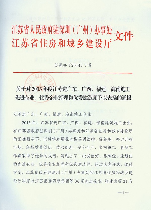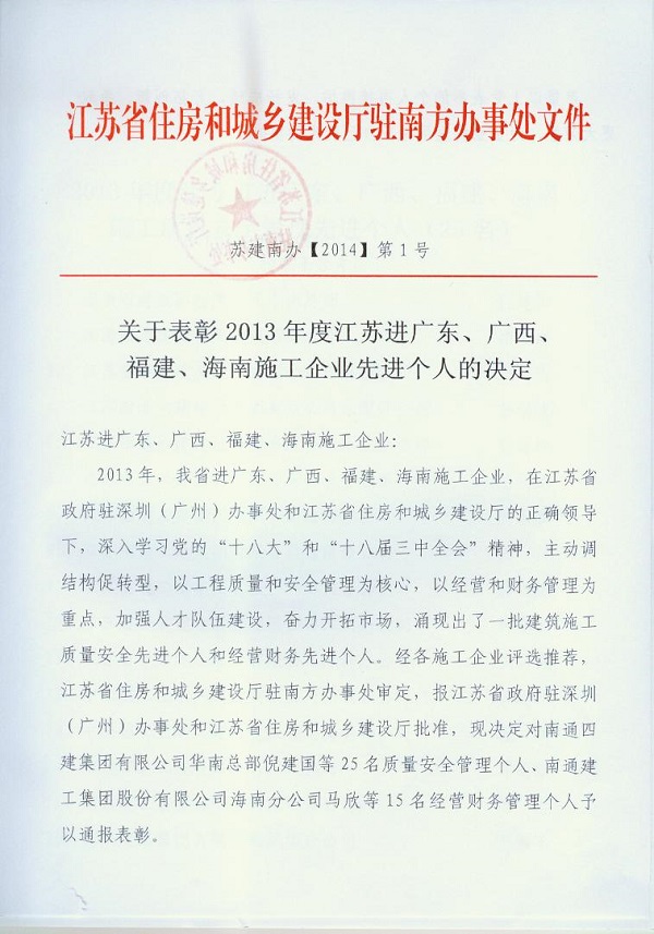 2013年江蘇進粵、桂、閩、瓊建筑施工先進企業、優秀企業經理、優秀建造師及經營財務管理、質量安全管理先進個人