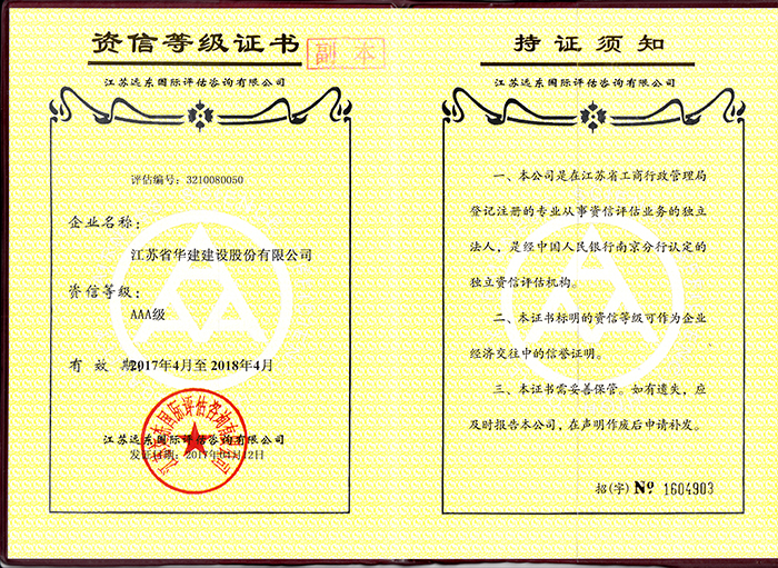經江蘇遠東國際評估咨詢有限公司專家委員會審定,江蘇省華建建設股份有限公司資信等級為AAA級...
