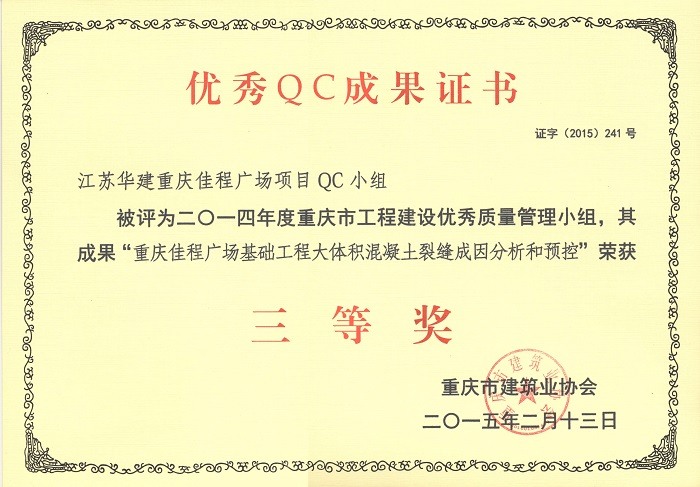 近日,重慶市建筑業(yè)協(xié)會發(fā)文表彰了一批優(yōu)秀QC成果,公司重慶佳程廣場項目QC小組被評為201...