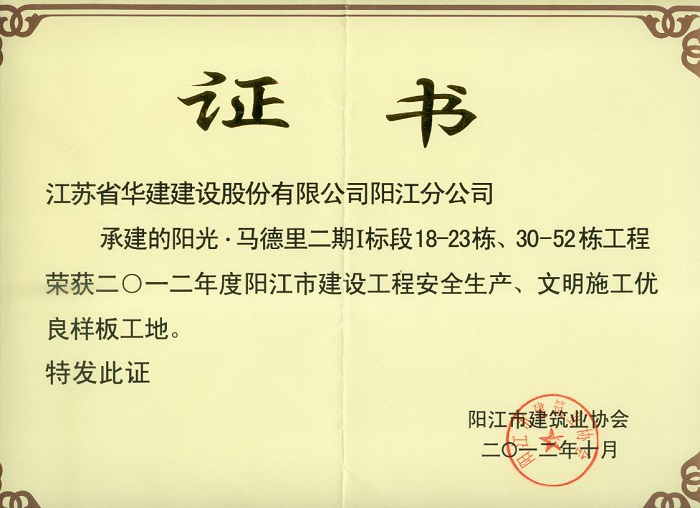 2012年陽光馬德里二期陽江市建設工程安全生產、文明施工優良...